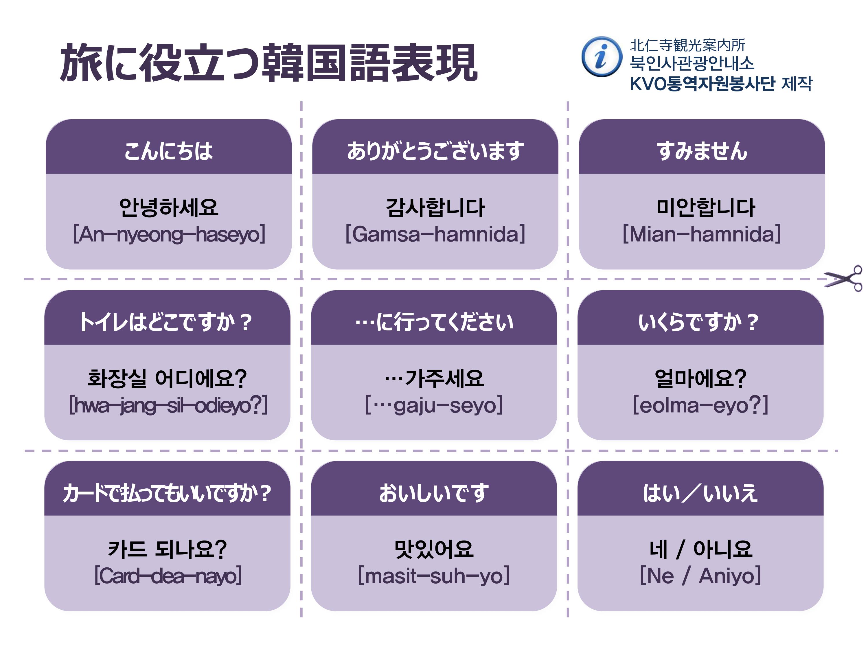 KVO 통역자원봉사단이 제작해 외국인 관광객 분들께 나눠 드리는 '여행 한국어 표현'입니다.